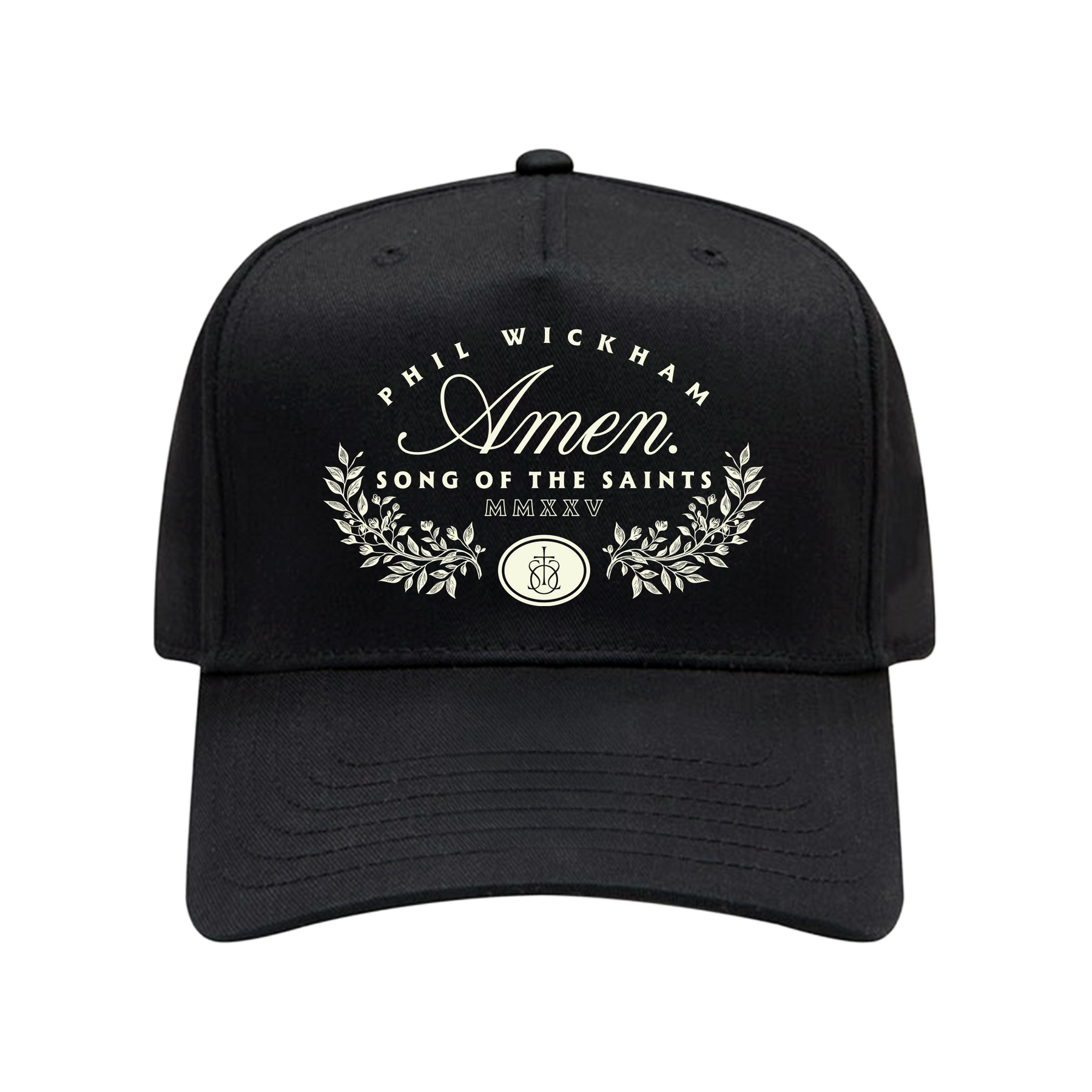 The "Amen Hat" features classic black fabric with Phil Wickham's reverent "Amen" declaration beautifully displayed in stitched white lettering. The standout front design showcases elegant flourishing botanical elements framing "Song of the Saints" with Roman numerals, creating a timeless tribute that honors both tradition and faith.